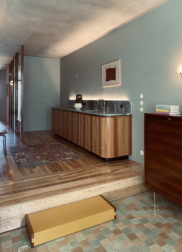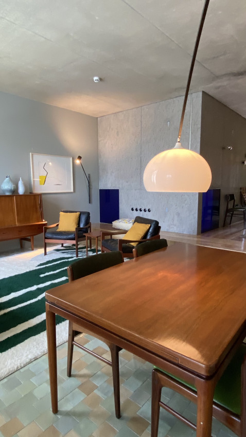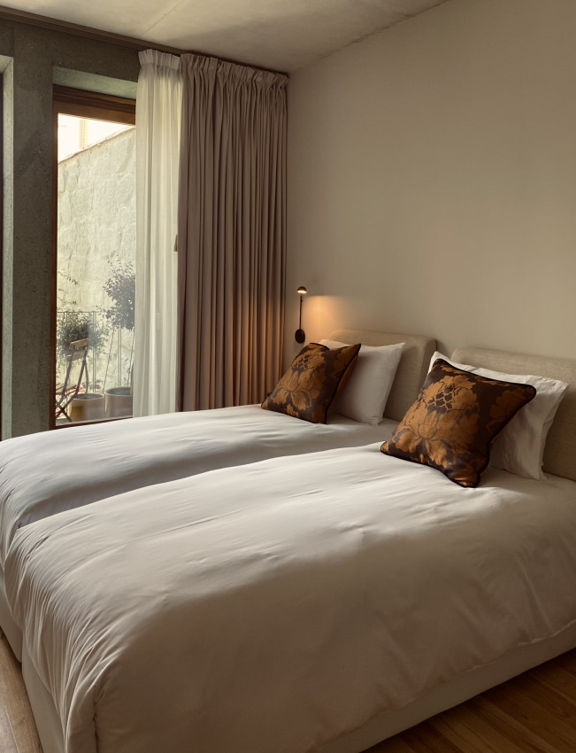 The ground floor is spacious, mediating the courtyard and the garden, and can function as a space for public events. Each apartment has a common room, a kitchenette, and two bedrooms, all of which are served by balconies. The interior atmosphere will maintain the refinement of finishes and the comfort of the furniture found in Casa e Tipografia do Conto.