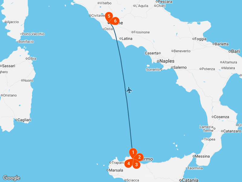 - 6 noites de alojamento: 2 em Roma + 4 na Sicília;